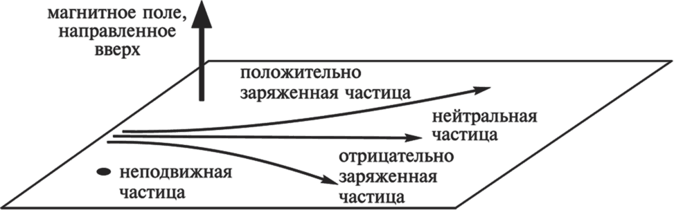 Если магнитное поле направлено вверх, оно закручивает положительно заряженные частицы против часовой стрелки, а отрицательно заряженные частицы – по часовой стрелке.