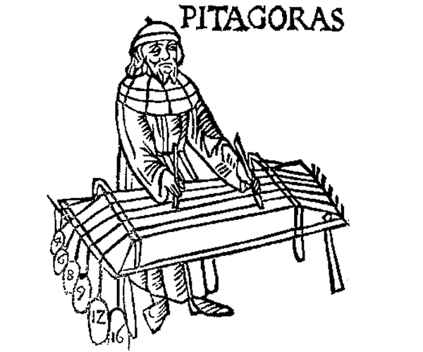 На следующем рисунке, который не принадлежит кисти Рафаэля, изображен Пифагор, проводящий эксперименты по гармонии.
