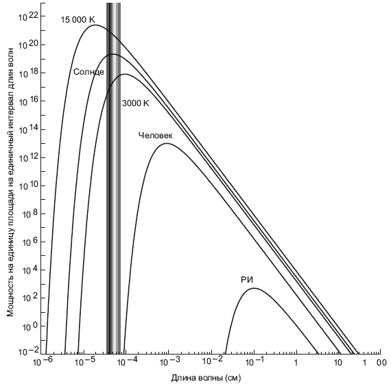 Теперь давайте отправимся в большую Вселенную. В главе 4 мы рассмотрели графики теплового излучения звезд. На рис. 5.1 изображена очень похожая диаграмма, но с некоторыми дополнениями. По оси ординат откладывается интенсивность (мощность на единицу площади на единичный интервал длин волн), а по оси абсцисс – длина волны (увеличивается слева направо). Часть спектра, которую мы именуем «видимый свет», как и выше, обозначена радужной полосой.