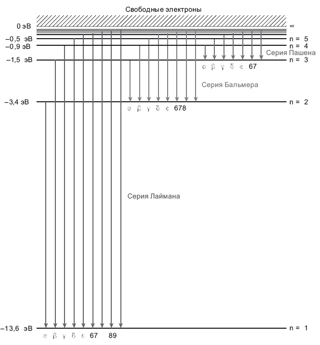 Рис. 6.2. Схема энергетических уровней водорода. Горизонтальными линиями обозначены различные энергетические уровни в атоме водорода в электрон-вольтах (эВ). Стрелками обозначены переходы электрона, при которых он может перескочить с одного энергетического уровня на другой, излучая фотон, энергия которого равна разности потенциалов между этими уровнями. Показаны переходы на первый энергетический уровень (серия Лаймана, где излучаются фотоны в ультрафиолетовой части спектра), на второй энергетический уровень (серия Бальмера, где излучаются фотоны видимого света) и на третий уровень (серия Пашена, ближний инфракрасный диапазон). На схеме показано, как электроны спускаются между энергетическими уровнями и излучают фотоны. Если электрон был на энергетическом уровне n = 3 и опустился на энергетический уровень n = 2, то он испустит фотон H? (серия Бальмера) с энергией 1,9 эВ.
