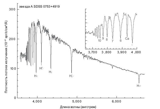 Рис. 6.3. Звездный спектр, в котором показаны линии поглощения серии Бальмера. Спектр звезды A, зафиксированной проектом «Слоановский цифровой обзор неба», содержит линии поглощения водорода из серии Бальмера; они называются H?, H?, H? и так далее. Линии наиболее густо расположены в районе самых коротких волн; во вставке крупным планом показан спектр, в котором обозначены линии вплоть до H10 (после H? принято использовать цифры, а не греческие буквы). Есть еще одна линия, связанная с присутствием слегка ионизированного кальция; она обозначена «Ca».