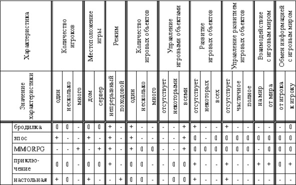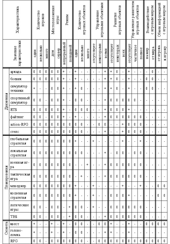 Существует множество жанров игр, причём достаточно чётких и определённых правил деления по жанрам не существует. Если перебрать все игры, то можно выделить их основные характеристики по которым можно составить таблицу принадлежности игры какому-либо жанру. Если обозначить знаками «+» обязательный атрибут, «0» ? возможный, а «-» ? недопустимый, то получится примерно таблица 1. Данная таблица не претендует на окончательность, но предназначена для внесения хоть какой-то ясности.