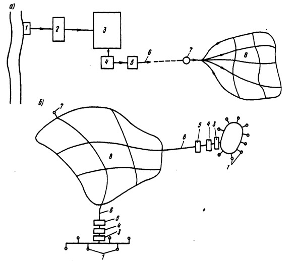 1 – водозаборное сооружение; 2 и 5 – насосные станции соответственно I и II подъема; 3 – очистные сооружения; 4 – резервуар чистой воды; 6 – водоводы; 7 – напорно-регулирующая емкость; 8 – водопроводная сеть.