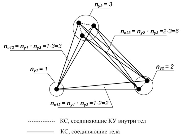 На Рис.2 в виде кружков изображены три условных материальных тела. Внутри этих кружков точками изображены узловые кванты, входящие в состав тел. Первое тело включает лишь один узловой квант, второе – два, третье – три. Все узловые кванты, согласно структурно-квантовой модели нашей Вселенной, каждый с каждым, соединены с помощью КС.