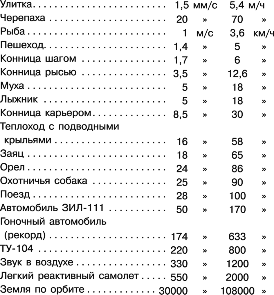 Сравнительно недавно в СССР был построен пассажирский теплоход с подводными крыльями, развивающий скорость 60–70 км/ч. На суше человек может двигаться быстрее, чем на воде. На некоторых участках пути скорость движения пассажирских поездов в СССР доходит до 100 км/ч. Новая легковая автомашина ЗИЛ-111 может развивать скорость до 170 км/час, семиместный легковой автомобиль «Чайка» – до 160 км/ч.