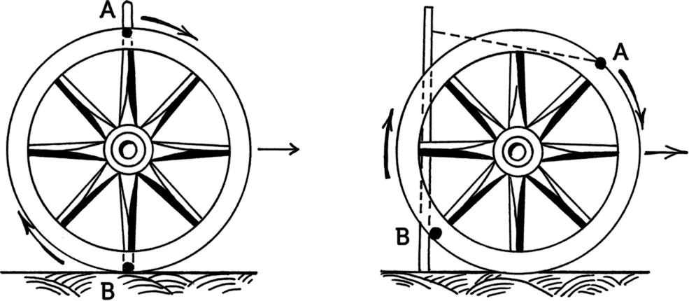 Рис. 7. Как убедиться, что верхняя часть колеса движется быстрее ни. жней. Сравните расстояния точек А и В откатившегося колеса (правый чертеж) от неподвижной палки.