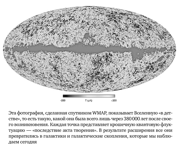 (В 1992 году предыдущий спутник – СОВЕ (космический аппарат для изучения реликтового излучения) – предоставил в наше распоряжение первые размытые снимки реликтового излучения, пронизывающего небеса. Полученные беспрецедентные результаты вызвали и определенное разочарование, поскольку представленная картина ранней Вселенной была несфокусированной. Это не помешало прессе возбужденно окрестить фотографию излучения «ликом Божиим». Но правильнее было бы сказать, что размытые снимки со спутника СОВЕ представляли «младенческую фотографию» Вселенной. Если посчитать сегодняшнюю Вселенную восьмидесятилетним старцем, то снимки, сделанные спутником СОВЕ (а позднее – зондом Уилкинсона для измерения анизотропии микроволнового излучения), фиксируют ее «новорожденной», когда ей и дня еще не исполнилось.)