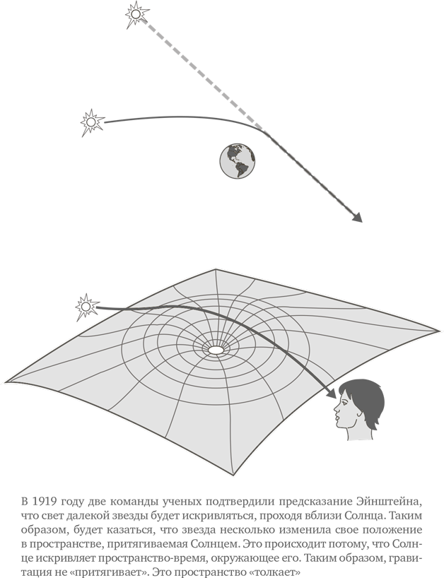 В конце концов в 1919 году, когда Европа, залечивая раны, пыталась выбраться из руин Первой мировой войны, по всему миру были разосланы команды ученых-астрономов для проверки новой теории Эйнштейна. Эйнштейн предположил, что искривление пространства-времени Солнцем будет достаточным для искривления звездного света, проходящего вблизи Солнца. Величину искривления звездного света можно было точно подсчитать, подобно тому как можно вычислить, насколько стекло искривляет свет. Но поскольку днем сияние Солнца скрывает все звезды, для проведения решающего эксперимента ученым пришлось ждать наступления солнечного затмения.