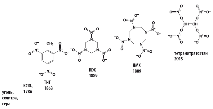 Ещё в XIX веке выяснив опытным путем, что нитросоединения взрываются, и тем громче, чем больше в их структуре содержится нитрогрупп, и отработав методологию получения органических соединений, содержащих нитро- и нитратогруппы, исследователи отправились в поход за получением новых органических нитросоединений, которые сразу после разработки технологии их получения становились и взрывчатыми веществами, и окислителями в пиротехнике.