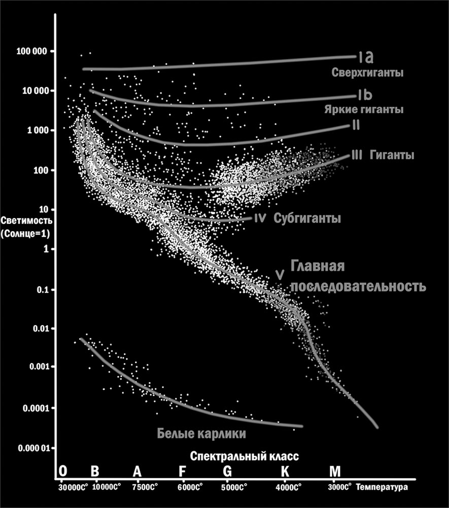 Диаграмма Герцшпрунга-Рессела. Слева на вертикальной оси указана светимость звезд, измеренная в Солнцах. Вверху расположены звезды, которые светят как сто, тысяча или сто тысяч таких звезд, как наше Солнце. Внизу – слабенькие звездульки, которые светят в сотни и тысячи раз слабее нашего Солнышка. На нижней горизонтали указана цветность звезд уже знакомыми нам буквами. Левее всего расположены звезды голубые и белые, в серединке желтенькие, ну а правее – красные и в конце совсем уже буро-коричневые. По-иному это называется цветовой температурой (значения температуры также указаны) – вы знаете, что если постепенно нагревать металл, например, то сначала он будет светиться еле заметным багровым цветом, затем засветится ярко-красным, потом ярко-желтым, а уж если довести его, как говорят, до белого каления, он и будет светиться белым. Со звездами то же самое – чем горячее, тем дальше от красного и ближе к белому. И тем ярче светимость.