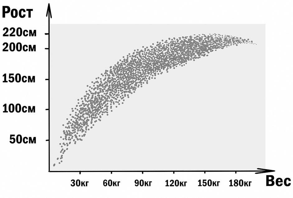Мы видим на диаграмме, что все люди располагаются на ней не по всей плоскости, хаотично заполняя ее, а с некоторым разбросом группируются в определенной области, напоминающей бумеранг. Почему? Да ясно почему! Потому что люди рождаются маленькими и, соответственно, легонькими. Затем они растут до взрослого состояния, быстро набирая вес, а потом расти перестают и, хотя вес продолжают набирать, толстеют они уже не так быстро, как тяжелеет растущий организм. Поэтому «бумеранг» и переламывается. Иными словами, на Главной последовательности людей отчасти видна их жизнь: они рождаются, растут, а потом помирают. Конечно, рост и вес у всех людей разные, но все-таки они заключены в некоторые видовые пределы – выше жирафа еще ни один человек не вырос и тяжелее слона не стал. У жирафов и слонов была бы своя Главная последовательность.