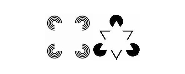 Кажется, что в центре левого рисунка находится белый квадрат, а в центре правого рисунка находится белый треугольник. На самом деле ни треугольника, ни квадрата нет. Это иллюзии, «нарисованные» рассудком в сознании. Существует огромное количество рисунков, создающих иллюзии в сознании. С помощью таких рисунков удаётся обмануть рассудок – побудить его собрать ошибочный образ, не соответствующий реальности. Сознание человека – это модель окружающего мира, а рисунки, создающие иллюзии в сознании, побуждают рассудок собирать ошибочную модель окружающей действительности.
