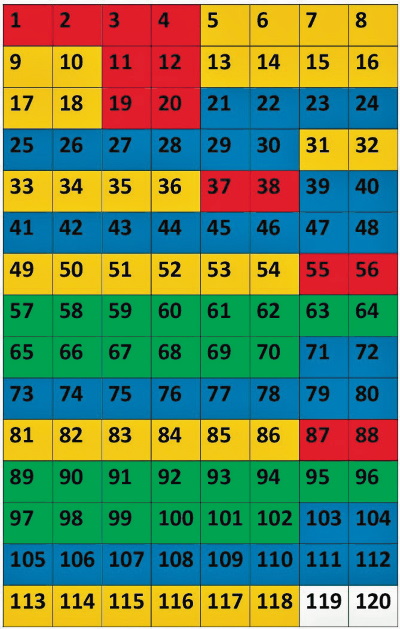 Здесь также 120 чисел. Но 8-ми разрядный «октавный Закон» Ньюлендса был математическим законом Периодической Таблицы химических элементов до 1989 года. Поэтому и мы будем ожидать высокой периодичности во множестве химических элементов в таблице 8 ? 15. На рисунке ниже представлена таблица 8 ? 15 химических элементов.