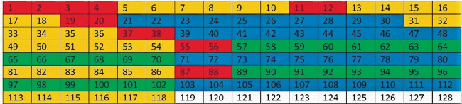 16-разрядную таблицу рассматриваем в связи с тем, что она кратна 8-ми разрядной таблице, а на 8-ми разрядной таблице достигли максимальной периодичности в 74,6 %. В этом случае в таблице 128 числовых элементов. Таблица химических элементов для этого случая: