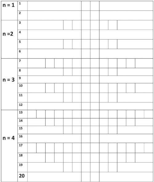 Пронумеруем ячейки последовательно в строго нарастающем порядке слева направо в рядах с последовательным переходом на нижележащие ряды сверху вниз. При этом номера n = 1, 2, 3, 4 Диад-Уровней и рядов 1-20, зафиксированные на рис. 10 и номера Диад-Уровней на рис. 11, опустим.