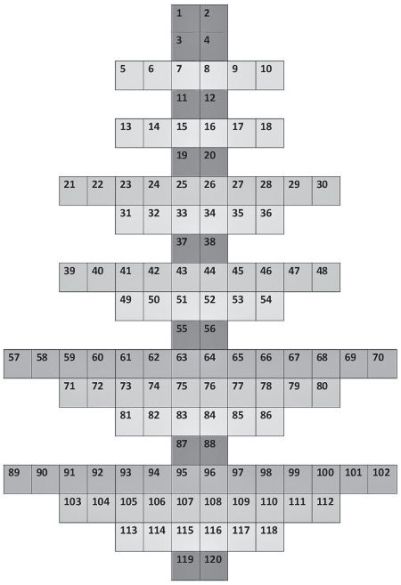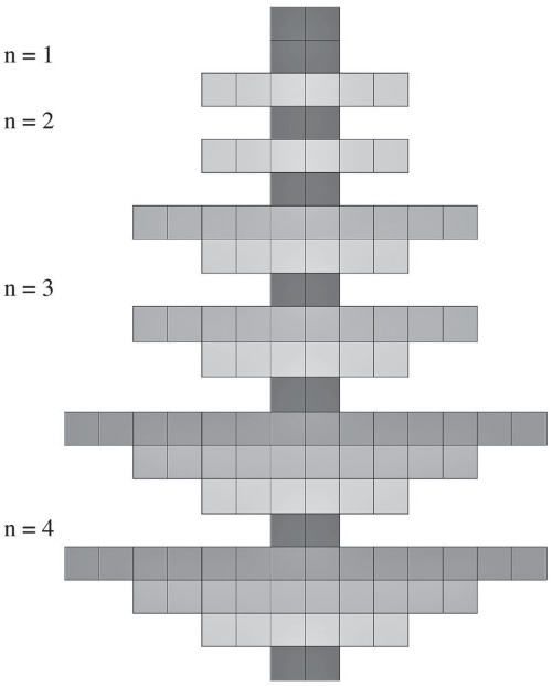 Ряды 1, 2,4, 6, 9,12,16, 20 состоят из 2 ячеек, ряды 3, 5, 8, 11, 15, 19 – из 6 ячеек, ряды 7,10, 14, 18 – из 10 ячеек, ряды 13, 17 – из 14 ячеек. В целом форма с ячейками напоминает ветвистую Ёлку. Ряды с двумя ячейками выглядят стволом Ёлки. Очевидно, ствол отличается от ветвей. И первые ветви Уровней n = 2; 3; 4 отличаются друг от друга. Таким образом, Ёлка составлена из ствола и трёх разных ветвей. Эти очевидные различия отразим тонами серой шкалы (gray scale).