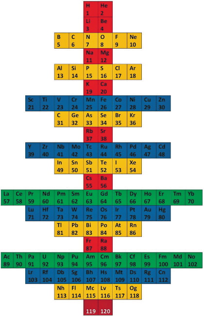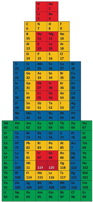 На рис. 12 и на рис. 16 ячейки с номерами дополним символами соответствующих химических элементов. Все существующие на сегодня химические элементы отнесены к 4-м блокам: s, р, d, f. Ячейки с химическими элементами этих блоков обычно отцвечивают соответственно красным, жёлто-оранжевым, синим и зелёным цветами. На нижеследующих рис. 19 и рис. 20 представлены числовая Ёлка на рис. 12 и Числовой Монумент на рис. 16 с символами химических элементов и в цветах ячеек s, р, d, f блоков. По логике формул (5) и (6) элементы 119 и 120 должны быть s-элементами. Но они ещё не обнаружены и не синтезированы. Ячейки с этими элементами отцвечены не красным, а тёмно-красным цветом.