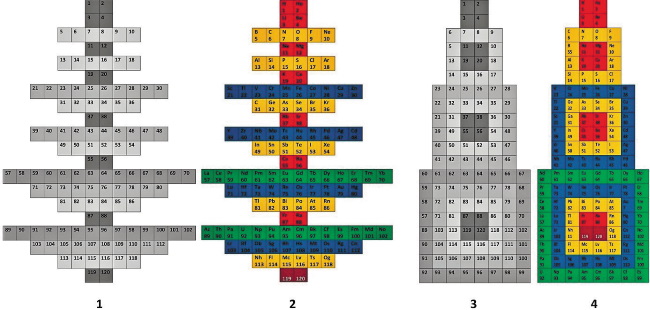 Сравнение фигур 1 с 2 и 3 с 4 на рис. 21 показывает совпадение типизации ячеек тонами серой шкалы и ячеек с цветами s, р, d, f блоков. Поскольку Систематизация и типизация ячеек с номерами 1-120 на фигурах 1 и 3 тонами серой шкалы были проведены исключительно математически, то и фигуры 2 и 4 представляют математическую Систематизацию и Типизацию химических элементов. Математическая типизация совпадает с квантово-механической типизацией s, р, d, f – блоками.