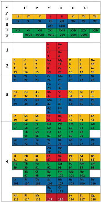 Наверху Таблицы помещена 5-рядная схема последовательности номеров групп в ячейках расцветок s, р, d, f блоков химических элементов. Эти номера относятся только к соответствующим цветам ячеек химических элементов, например, к красным группам I и II относятся только химические элементы в красных ячейках сверху вниз, а к зелёным группам XIX–XXXII имеют отношение по вертикалям только соответствующие лантаноиды и актиноиды. Медь с благородными металлами и группа Цинка оказались в одних столбцах с группами I и II, что ещё больше сближает эту Таблицу с короткопериодной VIII-групповой Таблицей Менделеева.