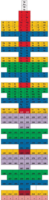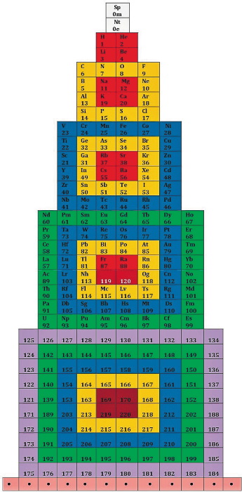 Поэтому пока ограничимся значением n = 6, причём многоточием для седьмого (от 0) Уровня. Ячейки с номерами в g-блоке и многоточиями с h-блока, следующих за f-блоком, отцветим соответственно бледно-фиолетовым и бледно-розовым цветами. Тогда неограниченная Система естественных элементов Вселенной представляется в нижеследующих вариантах 1, 2. и 3.: