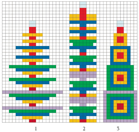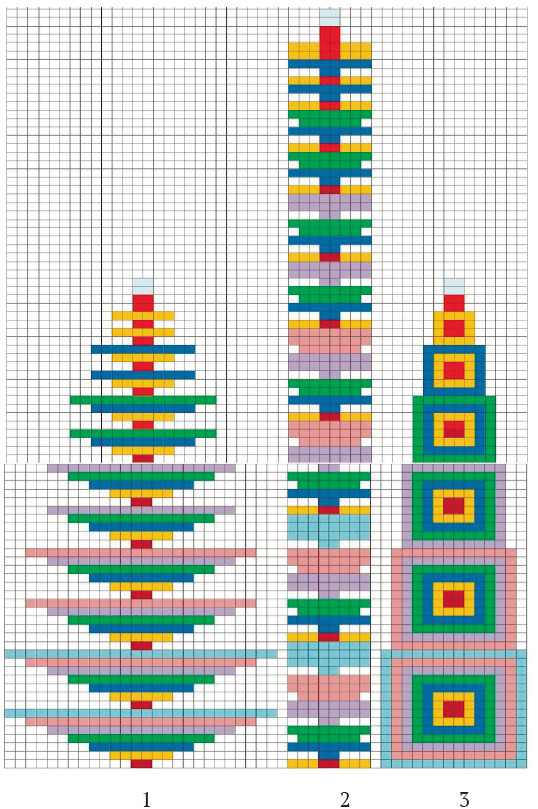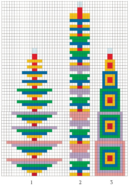 Сравнение с подобным совместным представлением нас рис. 39 для n = 0, 1, 2, 3, 4. показывает, что Диадно-октавная система «переросла» Ёлочную и Монументальную системы на 6 квадратиков вверх. Эта разница будет увеличиваться с увеличением n. Для n = 0, 1, 2, 3, 4, 5, 6 (с h блоком) высота Диадно-октавной системы превышает Ёлочную и Монументальную системы уже на 16 ячеек.