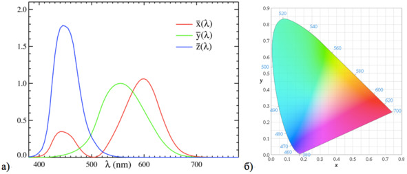 Рис. 3 а) Функции цветового соответствия Стандартного колориметрического наблюдателя, определённые комитетом CIE в 1931 году на диапазоне длин волн от 380 до 780 нм (с 5 нм интервалом) и б) диаграмма CIE