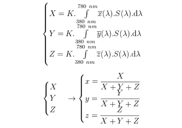 Полученные значения определяют координаты цветового вектора в трехмерном пространстве, однако удобнее задавать значение цвета через светолоту Y и две координаты x и y, определенные следующим образом: