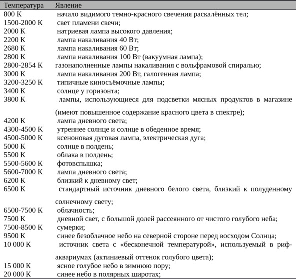 Табл. 1 Шкала цветовых температур распространённых источников света