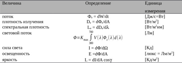 Все мы помним, что, хотя металлические предметы на морозе кажется холоднее деревянных, объективно их температуру можно сравнить только с использованием термометра, а не по собственным ощущениям. Со светом происходит то же самое, и сравнение разных источников света производят с помощью различных фотометрических параметров. Фотометрические величины включают: поток, плотность излучения, спектральную плотность, световой поток, силу света, освещенность, светимость и яркость. Потоком Ф называется мощность светового излучения в единицу времени, плотность излучения De – это нормировка потока на единицу поверхности, и спектральная плотность Le – это плотность излучения на единицу длины волны. Полезным бывает использование величин, зависящих от чувствительности глаза, поскольку, известно, что два источника с одинаковым потоком зеленого и синего света, соответственно, воспринимаются глазом по-разному: зеленый цвет воспринимается заметно ярче. Таковыми величинами являются световой поток Ф – величина, полученная путем интегрирования потока Фe по световой чувствительности человеческого глаза, яркость L – сила света на единицу поверхности, сила света I —световой поток, нормированный на пространственный угол, и освещенность E – световой поток на единицу поверхности.
