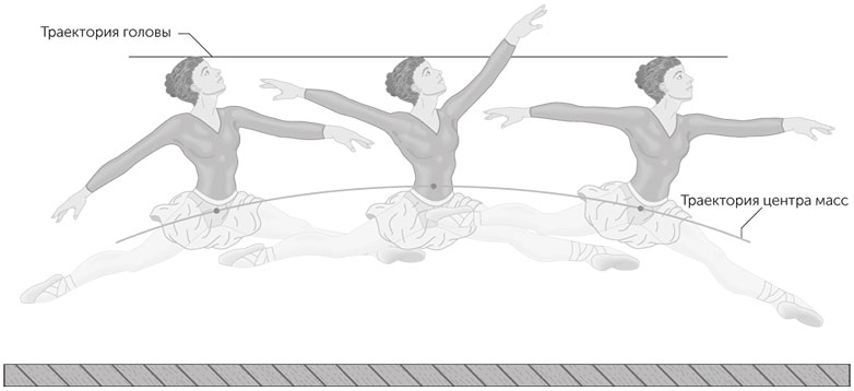ОТВЕТ • И в баскетболе, и в балете зависание в воздухе игроков и балерин – иллюзия. В баскетболе она возникает прежде всего из-за быстроты действий игрока, способного выполнить множество манипуляций во время прыжка. В балете – из-за движения рук и ног балерины во время гранд жете: после того как ноги оторвались от пола, балерина поднимает руки вверх и вытягивает ноги в горизонтальном шпагате, в результате центр масс перемещается выше по телу (рис. 1.11). И хотя он, как ему и положено по законам гравитации, движется над сценой по параболе, из-за его перемещения внутри тела уменьшается высота, на которой окажутся голова и тело балерины в высшей точке прыжка, по сравнению с той, которая бы была, не двигай она руками и ногами. В результате этих движений голова и туловище балерины во время средней фазы прыжка перемещаются почти по горизонтальной траектории. Она и кажется зрителям необычной, поскольку из повседневного опыта они знают, что полет должен происходить по параболе, даже если само это слово им незнакомо.