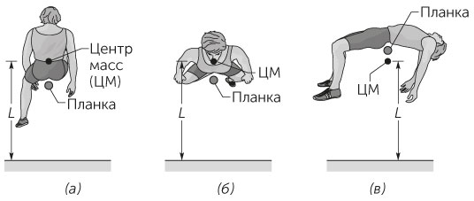 ОТВЕТ • 1. Высота, засчитываемая в соревнованиях по прыжкам в высоту, – это, естественно, высота планки, а не высота, на которой находится голова или иная часть тела прыгуна. Предположим, во время прыжка легкоатлет в состоянии забросить свой центр масс (ЦМ) на высоту L. Если атлет прыгает «ножницами», перебрасывая ноги через планку, то она должна находиться на высоте много меньшей L, поскольку спортсмен не должен коснуться ее никакой частью тела. Поэтому ее высота не очень велика (рис. 1.13а). При прыжке техникой «переката» тело располагается горизонтально, и когда атлет пролетает над планкой, та оказывается гораздо ближе к центру масс прыгуна. В этом случае может быть преодолена планка, установленная на большей высоте (рис. 1.13б). При прыжке «фосбери» (рис. 1.13в) тело атлета как бы обвивает планку, и в результате центр масс прыгуна оказывается вне туловища, и он может прыгнуть на большую высоту, чем при прыжке «перекатом». Изгиб тела при перелете через планку и поворот в последний момент, при котором прыжок совершается головой вперед, помогают выполнить этот высокий прыжок.