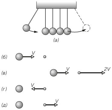 Популярная игрушка – «маятник Ньютона» – состоит из нескольких касающихся друг друга подвешенных на нитках шариков, которые могут раскачиваться как маятники (рис. 1.15а). Шарики сделаны из упругого материала, что означает, что лишь небольшая часть энергии шарика теряется при соударении с другими. Отведем крайний левый шарик назад и отпустим его. Он ударит следующий шарик. Почему после серии соударений отклонится только крайний шарик справа?