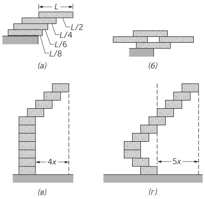 ОТВЕТ • Стопка находится в равновесии, если вертикальная линия, проведенная через ее центр масс, не выходит за границы стола. Таким образом, чтобы добиться наибольшего навеса, нужно, чтобы эта вертикаль проходила через самый край стола. Один из способов получить большой навес основан на гармонических рядах (рис. 1.22а). Допустим, мы строим башню из костяшек домино. Чтобы уравновесить костяшку, нужно положить ее так, чтобы ее центр приходился на край стола, и тогда получим навес, равный L/2. Потом положим на нее следующую костяшку и сделаем так, чтобы общий центр масс двух костяшек приходился на край стола. Навес теперь будет равен (L/2)(1 + 1/2). Потом положим на них третью костяшку и уложим стопку так, чтобы центр масс трех костяшек приходился на край стола. Новый навес будет равен (L/2)(1 + 1/2 + 1/3). Когда башня будут построена из n костяшек домино, навес башни будет равен (L/2)(1 + 1/2 + 1/3 + … +1/n), где выражение в скобках – гармонический ряд. Приведу несколько результатов.