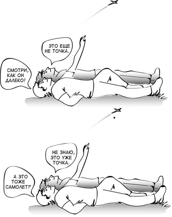 А вот что. Мы встанем далеко-далеко от самолёта – говоря проще, вернёмся с неба на землю. Нет, совсем на землю. А самолёт поднимем ещё выше. Настолько высоко, чтобы он казался точечкой. Во, теперь получилась материальная точка.