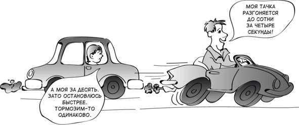 То есть, получается, если ты шпаришь на машине со скоростью 30 м/с (это 108 км/ч) и будешь плавно тормозить по 8 м/с (это почти 29 км/ч) в секунду, то значительно замедлишься только почти через 100 метров, а остановишься ещё дальше. (Для любознательных – вредное домашнее задание: посчитать, в какой момент времени наша машина остановится.)