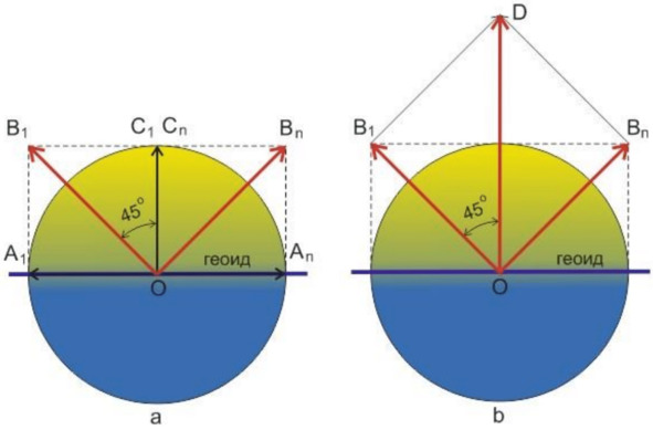 Возьмем два перпендикулярных направления векторов отлета крафонов – горизонтальное (боковое) и вертикальное, на которых с помощью параллелограммов построим результирующие векторы отлета крафонов на одном шарике (рис. 2.4.а). Таких параллелограммов будет множество, но ограничимся двумя (ОА1В1С1 и OСnBnAn). Из построения видно, что результирующие векторы крафонов – векторы гравитации (ОВ1 OBn) пройдут через центр шарика и будут направлены под углом 45о к касательной плоскости геоида.