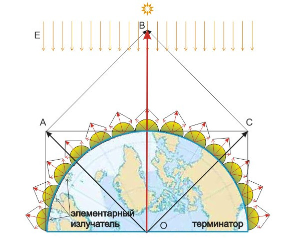 А теперь перейдем от микро к макро и построим подобные параллелограммы векторов на всем полушарии Земли, используя результирующие векторов всех элементарных излучателей (рис. 2.5.). В данном случае берем только дневное полушарие по границе терминатора (линия на диске планеты, отделяющая дневное полушарие от ночного). Ночное полушарие энергию только отдает, не получая ее извне.