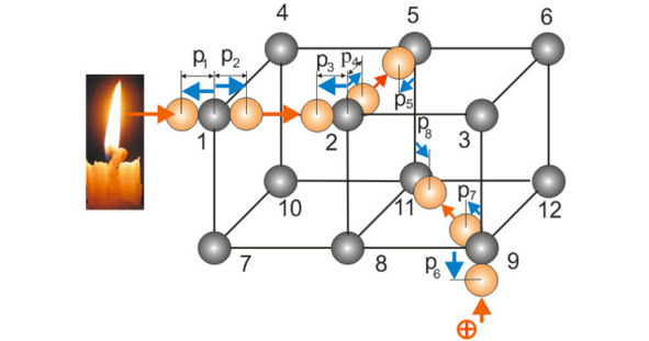 Кроме свечи и собратьев, атомы соли колеблют еще в большей степени крафоны земли. На рисунке 2.14 показан один из них, который дергает импульсом p6 атом №9 по вектору вниз (притяжение Земли). После поглощения данный атом испускает свой крафон, который дергает атом импульсом p7 в сторону атома №11, также получающий встречный импульс p8, заставляющий его сместиться на некоторое расстояние.