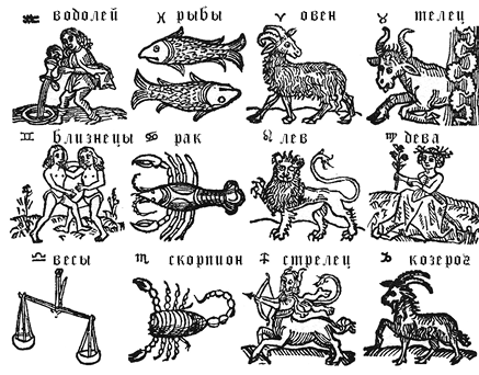 Деревянная гравюра с изображением двенадцати зодиакальных созвездий, которые все вместе обозначают годовой путь прохождения Солнца по небосклону