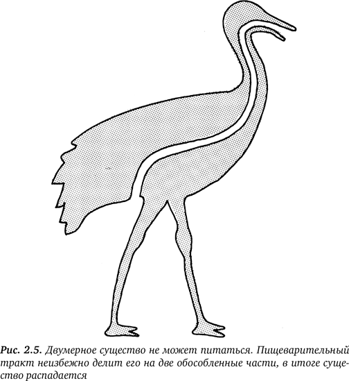 Некоторые учёные, восхищённые элегантностью решения Римана, пытались найти физическое применение столь мощному инструменту{16}. Одни исследовали его применительно к высшим измерениям, другие обращались к более практичным и приземлённым вопросам: например, как едят двумерные существа. Чтобы двумерные люди Гаусса могли питаться, их рты должны быть обращены вбок. Но если мы нарисуем их пищеварительный тракт, то заметим, что он полностью рассекает их тело (рис. 2.5). Таким образом, в процессе еды их тела разделяются на две части. В сущности, любая трубка, соединяющая два отверстия в их теле, будет делить их на две части, никак не скреплённые друг с другом. В результате мы встаём перед трудным выбором: либо эти люди едят так, как мы, и распадаются надвое, либо подчиняются другим законам биологии.