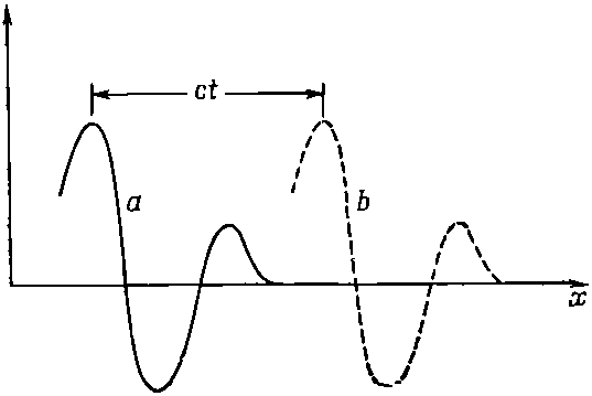 В этой главе мы будем рассматривать только такие волны, скорость которых не зависит от длины волны. Пример таких волн — распространение света в вакууме. Скорость света в этом случае одна и та же для радиоволн, для синего и зеленого света и вообще для света любой длины волны. Именно поэтому, когда мы описывали волновые явления, мы сначала и не заметили самого факта распространения волн. Вместо этого мы говорили, что если перенести заряд в некоторую точку, то электрическое поле на расстоянии х будет пропорционально ускорению заряда, но не в момент времени t, а в более ранний момент времени t- x/c. Поэтому распределение электрического поля в пространстве в некоторый момент времени, изображенное на фиг. 47.2, спустя время t передвинется на расстояние ct. Выражаясь математически, можно сказать, что в рассматриваемом нами одномерном случае электрическое поле есть функция от x-ct. Отсюда видно, что при t=0 оно оказывается функцией только х. Если взять более поздний момент времени и несколько увеличить х, мы получим ту же самую величину поля. Например, если максимум поля возникает при x=3 и в момент времени t=0, то положение максимума в момент времени t находится из равенства