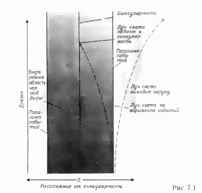 До 1970 г. я в своих исследованиях по общей теории относительности сосредоточивался в основном на вопросе о том, существовала или нет сингулярная точка большого взрыва. Но как-то вечером в ноябре 1970 г., вскоре после рождения моей дочери Люси, ложась спать, я задумался о черных дырах. Из-за своей немощности я очень медленно готовлюсь ко сну, и поэтому у меня было много времени для размышлений. Тогда еще не было точного определения, какие точки пространства-времени лежат внутри черной дыры, а какие — снаружи. Но мы уже обсуждали с Роджером Пенроузом определение черной дыры как множества событий, из которого невозможно уйти на большое расстояние. Это определение стало сейчас общепринятым. Оно означает, что границу черной дыры, горизонт событий, образуют в пространстве-времени пути лучей света, которые не отклоняются к сингулярности, но и не могут выйти за пределы черной дыры и обречены вечно балансировать на самом краю (рис. 7.1). Это как если бы, убегая от полицейского, держаться на шаг впереди, не будучи в силах совсем оторваться от него.