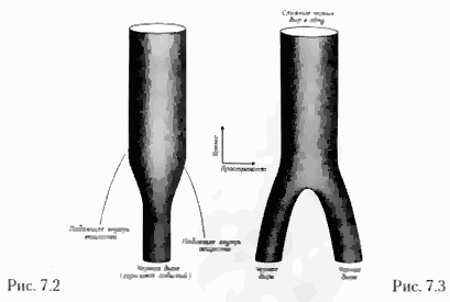 Если лучи света, образующие горизонт событий, т. е. границу черной дыры, никогда не смогут сблизиться, то площадь горизонта событий может либо оставаться той же самой, либо увеличиваться со временем, но никогда не будет уменьшаться, потому что ее уменьшение означало бы, что по крайней мере некоторые лучи света на границе черной дыры должны сближаться. На самом деле эта площадь будет всегда увеличиваться при падении в черную дыру вещества или излучения (рис. 7.2). Если же две черные дыры столкнутся и сольются в одну, то площадь горизонта событий либо будет больше суммы площадей горизонтов событий исходных черных дыр, либо будет равна этой сумме (рис. 7.3). То, что площадь горизонта событий не уменьшается, налагает важное ограничение на возможное поведение черных дыр. Я был так возбужден сделанным открытием, что почти не спал в ту ночь. На следующий день я позвонил Роджеру Пенроузу. Он согласился с моими рассуждениями. Я думаю, что на самом деле это свойство площадей Пенроузу было уже известно. Но он исходил из несколько иного определения черной дыры. Он не понял, что оба определения дают одинаковые границы черной дыры и, следовательно, одинаковые площади при условии, что черная дыра находится в состоянии, не изменяющемся со временем.