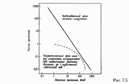Но даже если мы не сможем использовать излучение этих первичных черных дыр, то велика ли возможность их увидеть? Можно было бы искать гамма-излучение, которое черные дыры испускают на протяжении большей части своей жизни. Несмотря на то что черные дыры в основном находятся далеко и поэтому дают очень слабое излучение, суммарное излучение всех черных дыр могло бы поддаваться регистрации. Мы действительно наблюдаем фон такого гамма-излучения: на рис. 7.5 показано, как интенсивности наблюдаемых гамма-лучей различаются при разных частотах (частота — это число волн в секунду). Но источником этого фона могли быть, а может быть, и были не первичные черные дыры, а какие-нибудь другие процессы. На рис. 7.5 пунктиром представлена вычисленная зависимость интенсивности от частоты гамма-излучения, испускаемого первичными черными дырами, при плотности 300 черных дыр на кубический световой год. На основании графика можно сделать вывод, что измерение фона гамма-излучения не дает никакой положительной информации о существовании первичных черных дыр, но указывает на то, что во Вселенной не может быть в среднем больше 300 черных дыр в каждом кубическом световом году. Этот предел означает, что первичные дыры могли бы составлять максимум одну миллионную всего вещества во Вселенной.