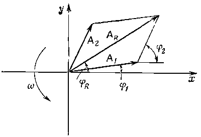 Горизонтальная проекция А2 равна A2cos(?t+?2). Из векторного анализа известно, что при сложении двух векторов по правилу параллелограмма образуется новый, результирующий вектор АR, причем x-компонента его есть сумма х-компонент слагающих векторов. Отсюда получаем решение нашей задачи. Легко проверить, что получается правильный ответ в нашем частном случае A1=А2=А. Действительно, из фиг. 29.9 очевидно, что AR лежит посредине между A1 и А2 и составляет угол 1/2(?2-?1) с каждым из них. Следовательно, AR=2Аcos1/2(?2-?1), что совпадает с прежним результатом. Кроме того, в случае А1-А2 фаза AR есть среднее от фаз A1 и А2. Для неравных A1 и А2 задача решается столь же просто. Мы можем назвать это геометрическим решением задачи.