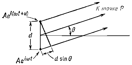 (Более подготовленный читатель, вероятно, умножил бы волновое число k, т. е. скорость изменения фазы с расстоянием, на d sin?, результат получится тот же самый.) Разность фаз, возникающая из-за разности хода лучей, есть, таким образом, (2?dsin?)/?, но из-за относительного запаздывания осцилляторов возникает дополнительная разность фаз ?. Отсюда полная разность фаз двух волн в точке наблюдения равна