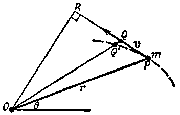 Прежде чем перейти к рассмотрению более чем одной частицы, применим полученные выше результаты к движению планеты вокруг Солнца. В каком направлении действует сила? Конечно, по направлению к Солнцу. А какой при этом будет момент силы? Разумеется, все зависит от того, в каком месте мы выберем ось, однако результат получится совсем простым, если в качестве точки вращения выбрать само Солнце. Поскольку момент силы равен силе, умноженной на ее плечо, или компоненте силы, перпендикулярной к радиусу r, умноженной на r, то в этом случае нет никакой тангенциальной составляющей силы, а поэтому момент силы относительно оси, проходящей через Солнце, равен нулю. Следовательно, момент количества движения должен оставаться постоянным. Давайте-ка посмотрим, что это означает. Произведение тангенциальной компоненты скорости на массу и радиус, будучи моментом количества движения, должно оставаться постоянным, потому что скорость его изменения есть момент силы, который в нашем случае равен нулю. Это означает, что остается постоянным произведение тангенциальной компоненты скорости на радиус, поскольку масса-то уж, конечно, не изменяется. Но такая величина, характеризующая движение планеты, уже вычислялась нами раньше. Предположим, что мы взяли маленький промежуток времени ?t. Какое расстояние пройдет планета при своем движении из точки Р в точку Q (фиг. 18.3)? Как велика площадь той области, которую «заметает» прямая, соединяющая планету с Солнцем? Пренебрегая площадью QQ'P, которая очень мала по сравнению с OPQ, находим, что площадь этой области равна половине основания PQ, умноженного на высоту OR. Другими словами, «заметенная» площадь равна половине произведения скорости на ее плечо. Так что скорость изменения этой площади пропорциональна моменту количества движения, который остается постоянным. Итак, мы получим, что закон Кеплера о равных площадях за равные промежутки времени является просто словесным описанием закона сохранения момента количества движения, когда моменты внешних сил отсутствуют.