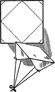 Ты тоже можешь сделать маленькую модель парашюта. Возьми квадратный лист плотной бумаги размером 168х168 мм. Размер не случайный: 168 мм — ширина листа из школьной тетради. Отогни углы, а самые уголочки перегни еще раз. Сгибы уголочков проколи иглой и пропусти по нитке, завязанной на конце толстым узелком, чтобы не выдернулась. Свободные концы всех ниток аккуратно выравняй и свяжи общим узлом.