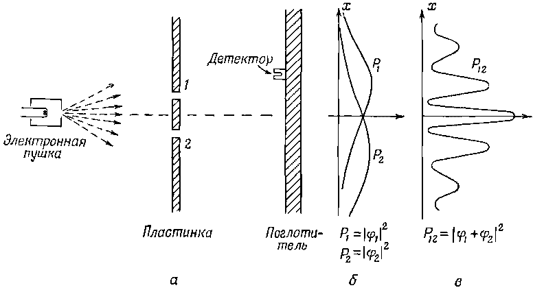 Мы поставим электронную пушку, которая состоит из вольфрамовой проволочки, нагреваемой током и помещенной в металлическую коробку с отверстием. Если на проволочку подано отрицательное напряжение, а на коробку — положительное, то электроны, испущенные проволокой, будут разгоняться стенками и некоторые из них проскочат сквозь отверстие. Все электроны, которые выскочат из пушки, будут обладать (примерно) одинаковой энергией. А перед пушкой мы поставим снова стенку (на этот раз тонкую металлическую пластинку) с двумя дырочками. За стенкой стоит другая пластинка, она служит «земляным валом», поглотителем. Перед нею — подвижный детектор, скажем счетчик Гейгера, а еще лучше — электронный умножитель, к которому подсоединен динамик.