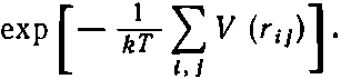 Предположим теперь, что мы заполнили этими молекулами какой-то ящик и хотим знать, как они там уместятся в среднем. На это даст ответ выражение ехр(-п. э./kT). В этом случае полная потенциальная энергия, если предположить, что молекулы взаимодействуют только попарно, равна сумме всех парных энергий (в более сложных случаях могут встретиться и тройные силы, но электрические силы, например, парные). Поэтому вероятность того, что молекулы образуют конфигурацию, характеризуемую заданными комбинациями расстояний rij, пропорциональна